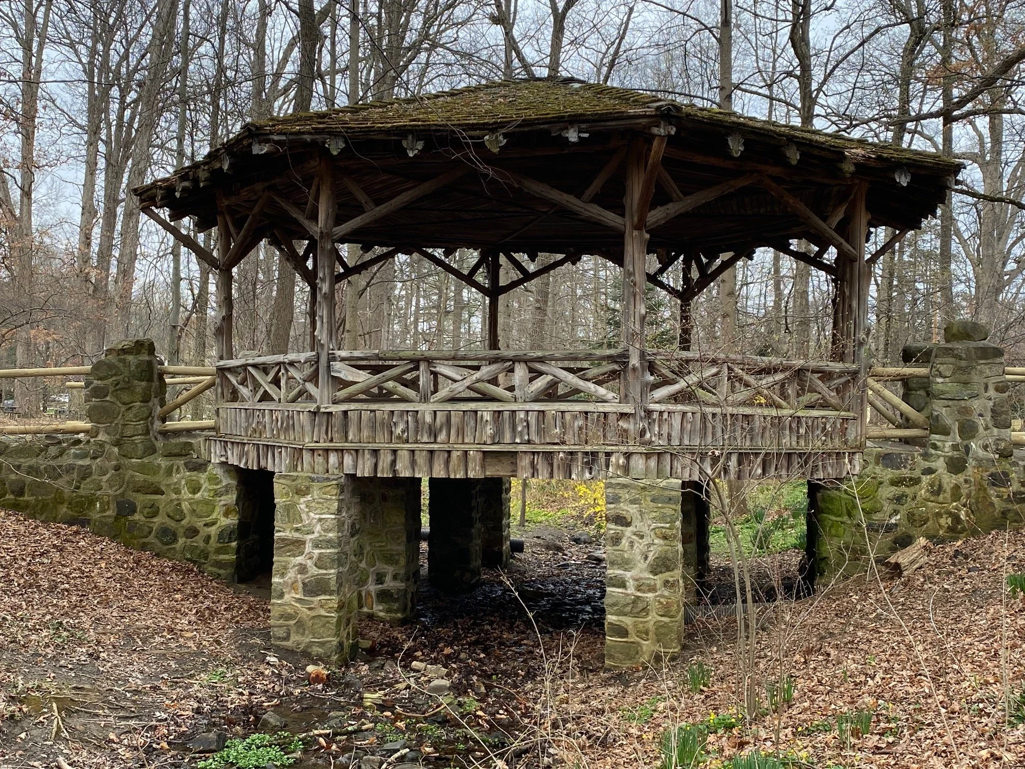 1908 – A rustic gazebo similar to the gazebo in Marshall Square Park is constructed over the stream to serve as a bridge and meeting place. Mr Farra reports that there are over 500 trees in the grove (L 10/27/08). This gazebo remains to this day.